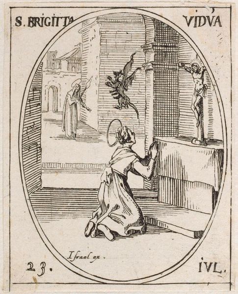 Curator: This is Jacques Callot’s small etching, “Saint Christine”. It’s part of a series depicting various saints, and what immediately strikes me is its intimate scale, despite the drama it depicts. Editor: It does have a certain quiet intensity. Christine seems to be confronting figures of authority, perhaps challenging societal norms or religious dogma. I wonder, what narratives of female resistance were circulating at the time this was made? Curator: Callot lived during a period of religious and political upheaval; such images offered both devotion and potentially, subtly, questioned power structures. The printmaking process itself allowed for wider circulation of such ideas. Editor: Precisely! It's fascinating to consider how this small image might have functioned within broader conversations about faith, gender, and resistance during its time. Thank you for shedding light on the context. Curator: My pleasure; context always deepens our understanding.