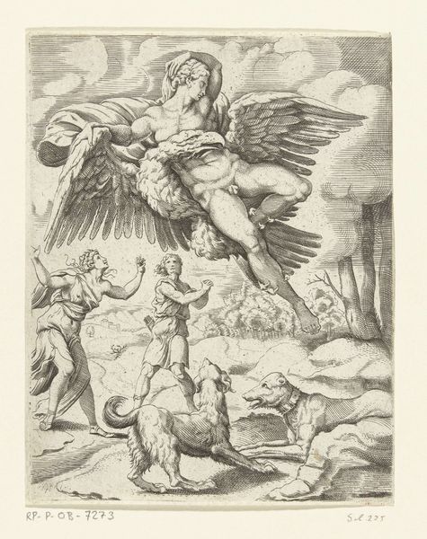 Editor: Here we have “Saint Michael Expelling Rebellious Angels from Heaven,” an engraving made between 1590 and 1610 by Joan Berwinckel. It has such a dramatic feel, with all that chiaroscuro lighting and swirling chaos. What are your initial thoughts when you look at it? Curator: The print is fascinating when considering the politics of imagery in its period. The drama, as you noticed, isn't merely aesthetic. Think of the Reformation – visual culture became a battleground. How do you imagine the public would react to the symbolism within this piece, the explicit visual message of good overcoming evil represented in Michael triumphing? Editor: I guess the symbolism of divine authority restoring order would resonate with people, especially given religious tensions back then? Is there a connection to events of that time that might shed light on its significance? Curator: Absolutely. Consider the Counter-Reformation’s use of art. The Church used these kinds of dramatic visual narratives to reassert its authority, to visually reinforce Catholic doctrine during a time of intense questioning. What do you notice about the composition and the gestures of the figures? How do they serve that purpose? Editor: Well, Michael has that strong, confident pose, crushing the defeated angel… almost looks like he's about to deliver the final blow. And the heavenly light shines exclusively on him. It is all very staged. So it aims to remind everyone of the Church’s ultimate power and righteousness, is what you are suggesting. Curator: Precisely. And consider the medium. Printmaking allowed for wider dissemination of this message, embedding this imagery deeply into the cultural consciousness of the time. What is fascinating for me is how effectively the visual narrative operates to convey that kind of ideology. Editor: I never thought about it quite that way, framing art as a visual argument within a historical power struggle. Thank you! Curator: Indeed. Analyzing art through a historical lens reveals a much more profound and nuanced understanding of not just the artwork but also the social and cultural values that it reflects and reinforces.