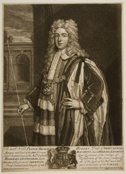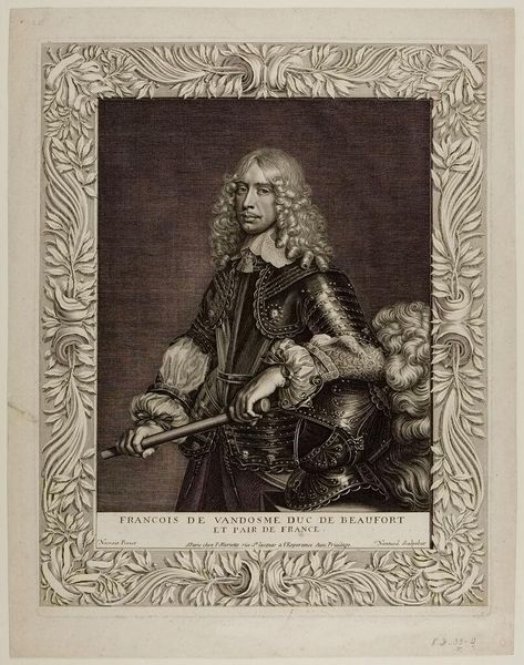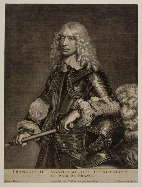 Curator: This is a portrait of Jacques François de Chastenet, Marquis de Puységur, rendered in print by Jean Daullé. Editor: It's striking. The detail in the armor and lace is incredible, giving it a tactile quality despite being a print. Curator: Absolutely. Daullé, who lived from 1703 to 1763, was a master of engraving, and this work reflects the aristocratic power structures of the era. The Marquis, holding what appears to be a military baton, is posed to convey authority. Editor: The baton, the armor... I wonder about the cost and the labor involved in producing those items. The print itself, although reproducible, also represents a skilled craft. Curator: Precisely. And the image also speaks to the performance of masculinity and social status within 18th-century French society. The Marquis's identity is carefully constructed through these visual cues. Editor: It's a powerful intersection of material display and social performance, immortalized through the engraver's craft. It certainly makes you think about all the labor that's often hidden behind aristocratic portraiture. Curator: Indeed. Hopefully, thinking about both the means and the message provides deeper insight.