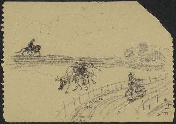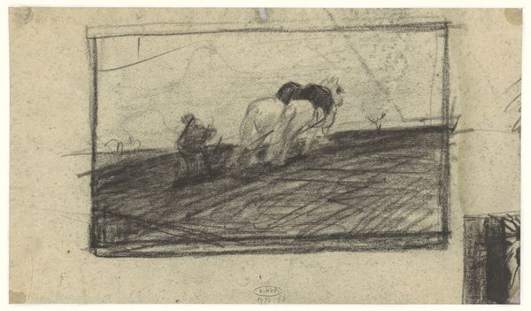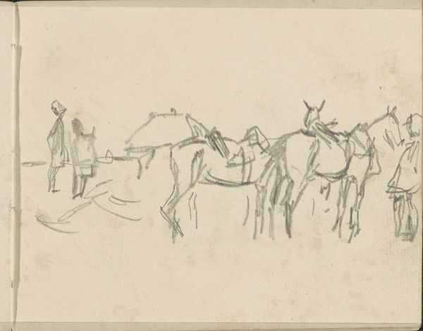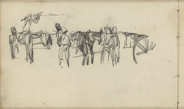 George Hendrik Breitner made this drawing, "Landschap met soldaten en paarden" – Landscape with Soldiers and Horses – sometime between 1870 and 1923. Breitner was a Dutch painter known for his depictions of city life in Amsterdam and his involvement in the Amsterdam Impressionism movement. This sketch provides insight into the artistic process of the time. Quick, gestural drawings like this were often used to capture fleeting moments and impressions of modern life. The loose lines and minimal detail suggest a focus on capturing the essence of the scene rather than precise representation. How does this fit into the broader history of military art? The military was undergoing significant changes, with industrialization and new technologies transforming warfare. Does this sketch reflect a changing attitude toward the military, perhaps a move away from glorification and toward a more documentary or critical perspective? Further research into Breitner's life, the social and political context of the Netherlands during this period, and the history of military art could help us better understand the meaning and significance of this drawing.
