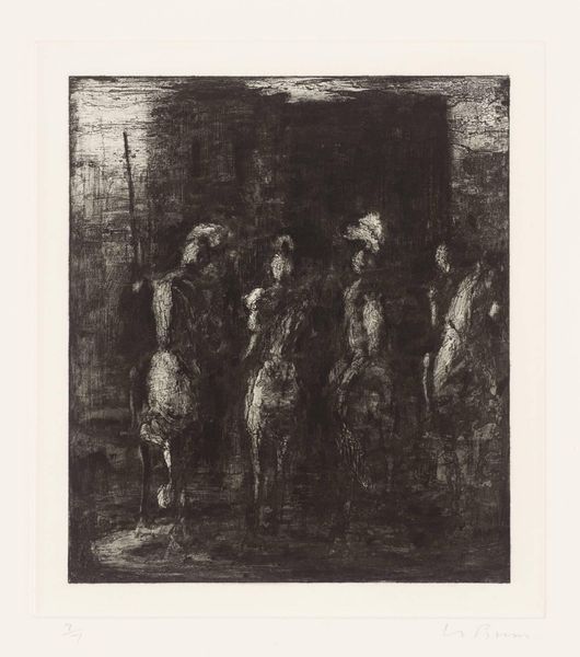 Curator: Let's explore this untitled etching by Julian Trevelyan, held within the Tate collection. It's a small work, roughly 26 by 26 centimeters. Editor: The atmosphere is immediately striking—claustrophobic and tense. The stark contrast and rough lines add to that sense of unease, like a bad dream. Curator: The imagery evokes ritualistic themes. Figures surrounding what appears to be an animal, possibly a bull, suggest themes of sacrifice or perhaps transformation. Editor: That's interesting. I read it as commentary on labor, the figures seem to strain under some immense weight, possibly alluding to the exploitation inherent to labor practices. Curator: Both interpretations resonate. Trevelyan was influenced by surrealism; the juxtaposition of familiar forms in an unfamiliar context may hint at collective unconsciousness. Editor: Whether symbolic rituals or socioeconomic systems, the image speaks to systems of power and how they exert pressure on individuals. Curator: A potent etching, it invites diverse narratives, reflecting the multifaceted nature of symbolic and social structures. Editor: Absolutely, a thought-provoking and discomforting reflection on unseen forces shaping our reality.