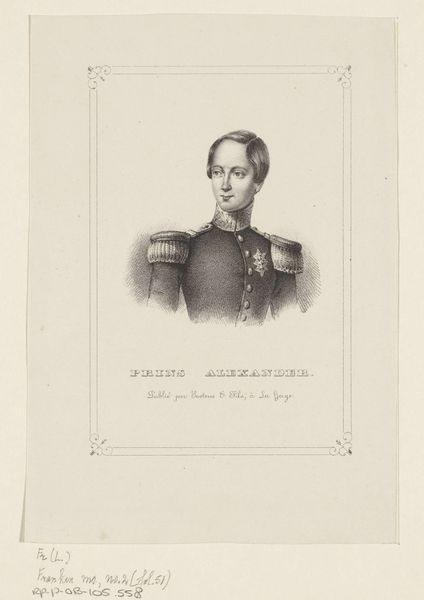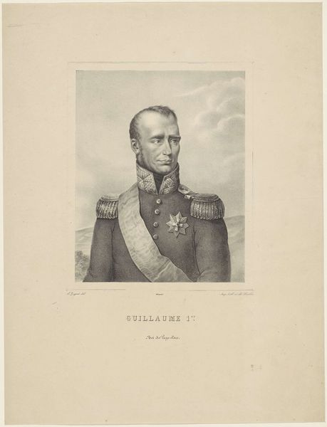 Curator: Here we have a print from between 1831 and 1833, depicting Willem II, King of the Netherlands. Hendrik Jan Heerenbrood is credited as the artist for this piece which now resides at the Rijksmuseum. Editor: Immediately, I’m struck by the coldness of this image. The King stands rigidly in his military attire, almost distanced from the battlefield scene behind him. Curator: Precisely, Willem II is positioned as this almost neoclassical hero. It’s a portrait intended to convey authority and military prowess. Note how the composition employs a backdrop suggestive of a victorious military encampment. Editor: While his stance aims to communicate power, I see something fragile in it. His arms are tightly crossed, creating a defensive posture—almost as if he is trying to hold himself together in a moment of uncertainty, regardless of any triumph. Curator: It’s a complex intersection, certainly. Consider the political climate: The Netherlands was solidifying its national identity and this kind of representation reinforces the monarchy's importance to that identity. Academic art in the 19th century frequently served such explicitly propagandistic functions. Editor: I’m curious, who was this print really aimed at? Was it intended for popular consumption, fostering a sense of national unity, or more for the consumption of the elites of the time? Its success depends greatly on audience interpretation. To me it appears that this archive photography aims to represent dominance of the ruler and is more political propaganda than true portrayal. Curator: It was most likely aimed at a broad public, hoping to disseminate an image of a strong leader post-independence. Printmaking allowed for wider circulation of such images, shaping public perception on a scale previously unattainable. Editor: Yet, its formality might alienate some. How would an average citizen during that time react to this highly staged, regal portrayal during the advent of a more democratized society? Curator: It’s a pertinent question to consider how accessible the symbolism was. What resonates as power for some, might read as alienating to others. The map and the sword might carry different significance depending on class and experience. Editor: Indeed. While analyzing such work it's important to contextualize it within socio-political issues of the time period while also appreciating how those messages affect us in present day society. Thank you for offering such useful insight on the artwork. Curator: Of course, analyzing artwork's ability to not only function during the period it was produced but even today makes evaluating work rewarding. Thank you.