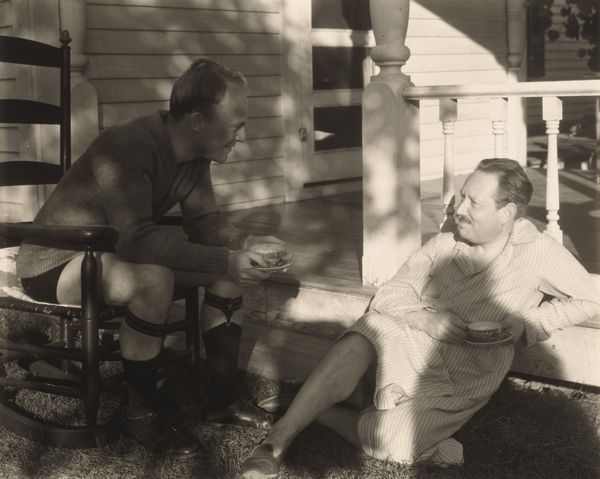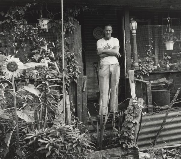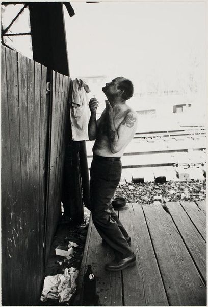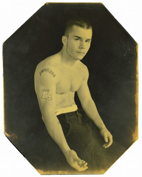Editor: Dylan Vitone's black and white photograph, "moebar mahony," presents a man in a doorway. The cross above the doorway juxtaposed with the man's tattoos creates an intriguing tension. What symbols or cultural references stand out to you? Curator: The cross above the door can symbolize protection or faith, a beacon. However, the man's tattoos might represent a different set of beliefs or experiences. Does the juxtaposition strike you as harmonious or discordant? Editor: Discordant, definitely. It feels like a challenge to traditional notions of religion or morality. Curator: Indeed. Tattoos themselves carry a layered history, from rebellion to self-expression. The doorway becomes a threshold, not just physical, but symbolic. What transitions might the man be facing? Editor: Now I see how the doorway and tattoos add layers of meaning to his identity. Curator: Precisely. Symbols can be incredibly personal, cultural, and even contradictory.