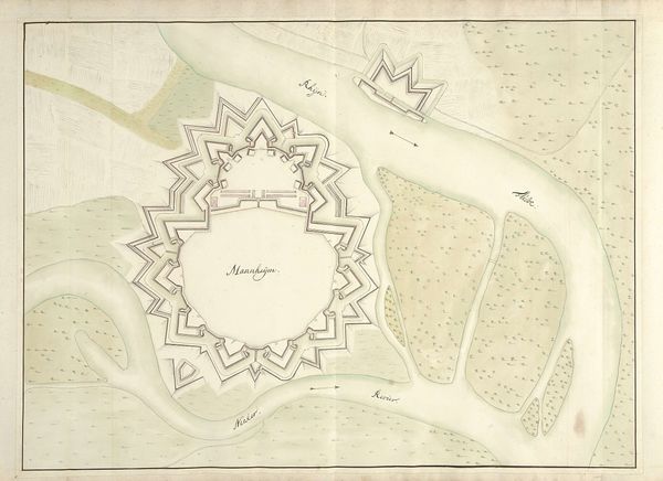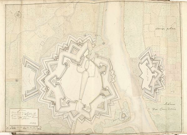 Editor: Here we have a drawing titled "Plattegrond van Kortrijk, 1706" by Samuel Du Ry de Champdoré, created sometime between 1706 and 1712, utilizing print and etching. It seems to be a cityscape, perhaps a map? I'm struck by its intricacy, all those lines forming such a defined structure. What’s your interpretation of this piece? Curator: Indeed, this meticulously rendered etching presents us with more than just a map; it’s a carefully constructed statement of power and control. This is a Baroque era depiction of Kortrijk, a city strategically important, given its location. Editor: How so? Curator: Consider the prominent fortifications, their elaborate angles and placements – all designed to project military strength. These weren't just defensive structures; they were symbols of authority in a politically turbulent Europe. Editor: I see, it’s about asserting dominance. So, what purpose would a map like this serve back then? Was it purely functional, for military planning, or something more? Curator: It served both pragmatic and propagandistic functions. It aided military strategists, yes, but also visually communicated the might and sophistication of the controlling power. Note how even in representing space, the landscape itself becomes an argument for control, visibility and strategic planning becoming aesthetic values. The 'Cityscape' isn't neutral, it is entirely framed for a viewer to have control, isn't it? Editor: Absolutely! It reframes how I view maps now, not just as practical guides but as instruments of power, projecting political ambitions. Thanks! Curator: My pleasure! Analyzing such cartographic works helps us decode how even seemingly objective representations are steeped in social and political intention. It certainly enriches our understanding of art's broader impact.