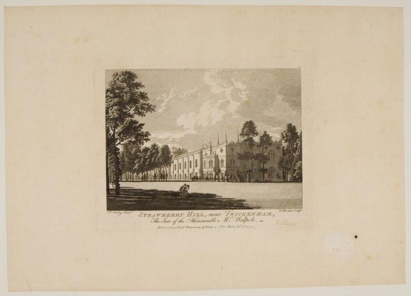 Curator: Francis Chesham created this print, "Burghley, Seat of the Earl of Exeter," depicting a sprawling estate. It feels quite picturesque, doesn't it? Editor: Indeed. There’s a distinct sense of idealized land ownership here. The meticulous detail renders not just a landscape, but a statement about power and class. Curator: The image certainly emphasizes the estate's prominence within the social fabric of the time. It acts as a visual representation of the Earl’s influence and control. Editor: Precisely. This print is more than just a scenic view; it's a carefully constructed narrative that reinforces the existing social hierarchy and normalizes such disparities. Curator: Yet, Chesham’s artistry in capturing light and shadow also gives the print a certain timeless appeal, regardless of its social context. Editor: Perhaps, but that timelessness is itself a product of overlooking the narratives it silences. Still, it offers a window into understanding 18th century concepts of wealth and privilege.