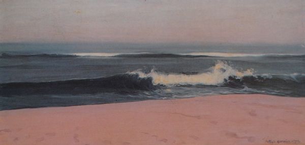 Editor: Here we have Joseph Lorusso's oil painting, "At Last Light". There's something very calming and slightly melancholic about the piece with its muted colors and expansive sky. What do you see in this painting? Curator: Well, I immediately notice the deliberate staging of nature. The artist seems very aware of the sublime, and perhaps even more, the market appeal of that feeling. These coastal landscapes gained prominence in the 19th century as industrialization pushed city dwellers to seek solace in idealized scenes. Lorusso taps into that continuing desire. Do you see the subtle details that might suggest the contemporary viewer? Editor: You mean the figures walking along the shore? They seem quite small in the grand scheme of things. Curator: Exactly. Think about how their presence impacts the larger narrative. It suggests a longing for simpler times, perhaps a rejection of modern complexities, but it is, ironically, for sale. The painting presents nature as a spectacle for consumption, reinforcing the social divide where access to such scenes is a privilege. Consider how institutions and private collectors shape artistic narratives to promote certain values and experiences. Editor: That's a perspective I hadn’t considered. I was more focused on the emotional impact of the colors and the scene itself, rather than its place within a system. Curator: The emotional response is valid, and carefully constructed, but it's essential to analyze how art also functions as a commodity that perpetuates specific social and political ideals. Is this piece an escape or another shackle of society’s values? Editor: This makes me look at landscapes very differently now. It’s more than just pretty scenery; it’s a loaded representation! Curator: Indeed. It's a continuous dialogue between artistic expression, cultural context, and societal structures. Art encourages these connections between personal feeling and institutional influence.