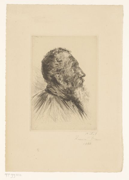 Curator: I'm struck by the vulnerability in this portrait; it feels surprisingly modern for something created in 1896. There's a gentleness I didn't expect. Editor: Indeed! We’re looking at Jan Veth’s “Portret van Albert Cornelis Vreede,” held here at the Rijksmuseum. Vreede, a notable Dutch historian and linguist, is rendered in delicate pencil work. What initially captivates me is the way Veth captures Vreede's thoughtful introspection. The soft lines around his eyes suggest a life lived in contemplation, almost like peering into one’s memories. Curator: And it's framed, literally, within that severe rectangular border! The face itself breaks out of the convention by being shown in profile, not head-on. The composition, which feels old-fashioned, in effect enhances Vreede's presence rather than restricting it. He seems poised to step right out of it and into a direct conversation! Editor: I find the details so compelling. His beard, for instance. It's not just a beard; it’s a wispy symbol of wisdom and time. Consider the cultural weight beards held in the late 19th century—a marker of intellect, respectability, and a connection to tradition. It's like Veth isn't just sketching a man, but rather an emblem of a scholarly age. The use of line reminds me of woodblock printing but the result is softer. Curator: Absolutely. And in Dutch culture at that time, the role of the intellectual was deeply tied to national identity and the shaping of historical narratives. Vreede's dedication to language and history positioned him as a guardian of Dutch heritage. And portraits were like enshrining, embedding people into the consciousness of a culture. Editor: I also notice the artist’s signature nestled discreetly, almost shyly, to the right. Curator: Almost as if to avoid distracting from the real subject – Vreede, the man and the mind. Jan Veth seemed quite skilled at capturing not just likeness, but a certain emotional tenor in his subjects. This resonates with the idea that the best portraits capture something enduring about the human spirit, it carries an essence of cultural identity. Editor: Yes, and the image really captures a transitional moment—the twilight of old-world intellectualism meeting a burgeoning modern sensibility. Curator: Well, it’s fascinating how Veth's sketch provides so much to interpret—beyond just a simple depiction of a man with an interesting beard. It is truly is a window into a specific time, into how people valued knowledge, dignity, and public life.