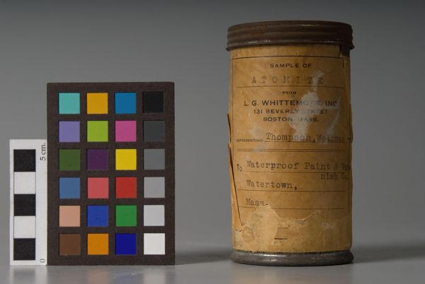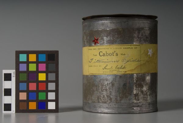 Curator: Well, isn't this fascinating? We have here "Lamp Black," manufactured by R.R. Cameron. It's essentially soot captured in a jar—like bottled shadows from 1929. Editor: It has such a stark, almost somber presence. The jar itself feels like a vessel holding…potential, or maybe even suppressed memories. The label looks so fragile against the darkness. Curator: Lamp black pigment has a long history. It's made from burning oil lamps or other carbon-rich materials. Think about how much of our industrial past relied on such simple, yet powerful, materials. Editor: It definitely complicates our contemporary relationship to carbon. When we see lamp black, we must confront the fact that for centuries this simple jar of pigment was a raw material for industrialization and environmental degradation. What a complicated object. Curator: Complicated, yes, but also beautiful in its own stark way. It's a tangible link to our past, both the artistic and the industrial. Editor: Absolutely. It reminds me how deeply implicated all art is within the larger systems and structures that govern us. Curator: So true, it is just a jar of pigment, but it’s like looking into a mirror that reflects not only our artistic heritage but also our environmental footprint. Editor: Yes, precisely. A potent reminder that beauty and responsibility are inextricably linked.