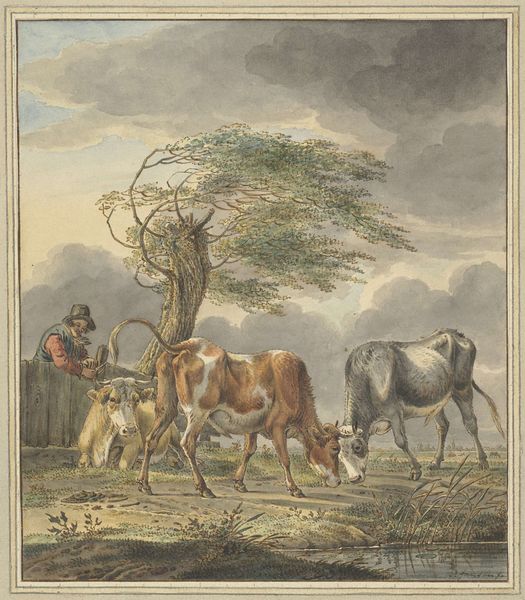 Jan Hulswit made this watercolor of cows and sheep by a cottage at the turn of the 19th century. Hulswit's pastoral scene reminds us that landscape painting wasn't just about pretty views; it was deeply tied to ideas about land ownership, labor, and national identity. During Hulswit's lifetime, the Dutch Republic was undergoing major upheaval. The old aristocratic order was crumbling, and new ideas about democracy and individual rights were taking hold. These changes had a profound impact on how people saw themselves and their relationship to the land. Artists began to focus on the everyday lives of ordinary people. Hulswit’s painting romanticizes rural life, yet it also reflects a subtle negotiation of class and social hierarchies. The animals, symbols of wealth and sustenance, are rendered with care, while the cottage suggests a simple, perhaps idealized, existence. Look at how the soft light and muted colors evoke a sense of tranquility and harmony, inviting us to reflect on our own connections to the natural world. What does this rural scene suggest about the values and beliefs of the time?