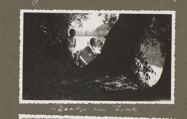 Curator: We are looking at "Landschap op Banda Besar," which translates to "Landscape on Banda Besar." The piece, an albumen print mounted on cardboard, was created by the photographer C. Dietrich between 1875 and 1890. Editor: My first thought is a hushed quiet. Even in this monochromatic world, I sense the humidity, the way sounds get absorbed by the dense greenery. It feels meditative, like witnessing a secret. Curator: This photography is rooted in the context of colonialism. We can think about who had access to cameras at this time, who was being photographed, and what the circulation of these images tells us about power dynamics in colonial Banda Besar. Editor: I see the single figure perched on a rock amidst a tumbling landscape of stones and foliage. Their solitude strikes me; they appear both tiny and monumental at the same time. It makes you wonder what their story is and their connection to the land. Curator: The image leans into pictorialism, which often used soft focus and painterly effects to elevate photography to the level of art. How does Dietrich employ these techniques to construct a particular vision of the landscape and, perhaps, the relationship between the colonizer and the colonized? Editor: The way the light filters through the canopy creates such a beautiful pattern. The dark, leafy surroundings against the tiny, sunlit figure. Maybe the photograph suggests something about human intervention amidst nature’s vastness. The contrast could signify dominion, or perhaps… humility. It depends how you interpret it, right? Curator: Absolutely. Reflecting on such visual cues allows us to engage critically with the photography. Considering photography's ability to not just reflect but to create new socio-cultural meanings during its period, this piece invites us to consider our own position and how we perceive colonial narratives today. Editor: Yeah, looking at this now, it almost seems like the little figure is part of a fairytale – one where humans try to become one with nature, if only for a snapshot.