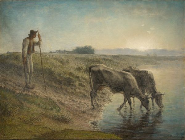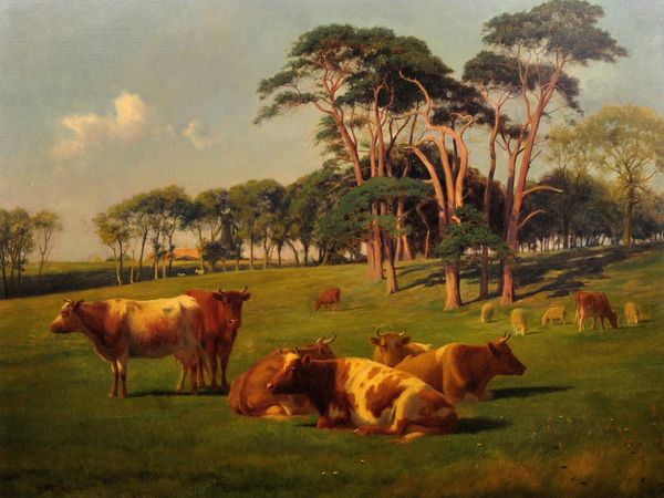 Hans Thoma painted this scene of twilight on Lake Garda with oil on canvas. It's got a kind of dreamy, fairy-tale atmosphere, right? I'm really drawn to the way the light filters through the trees, giving everything a soft, almost hazy quality. It’s as if Thoma wasn't just painting what he saw, but also how he felt being there. I can almost feel the dampness of the grass! The colours are mostly muted greens and browns, with touches of light on the cows and the boys. Up close, you can see how Thoma applied the paint in layers, building up the textures. Take a look at the way he suggests the leaves and foliage, it’s more about capturing the feeling of a lush scene rather than a photographic likeness. It’s this sense of suggestion, of leaving room for the viewer’s imagination, that really makes the piece for me. I am reminded of Caspar David Friedrich, who also sought to capture the sublime aspects of nature through paint. Both artists see artmaking as an ongoing conversation, ideas flowing across time.