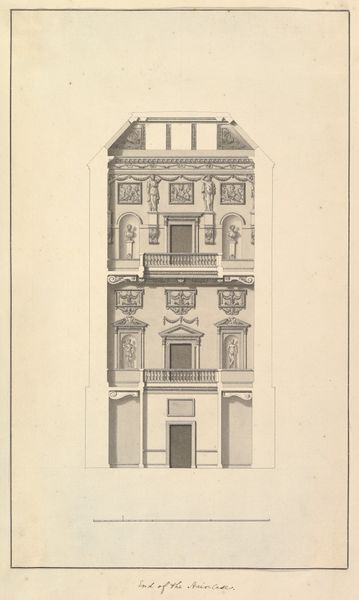 Jean Pelletier made this print of a building facade with columns, a balcony, and statues. This kind of architectural drawing would have been produced in France in the late 18th century. It's a period when the design of buildings was increasingly understood to be a reflection of social order. Architects in France, often trained in the state-sponsored Académie Royale d'Architecture, sought to use classical forms in innovative ways. The goal was to create buildings that were not only functional but also conveyed ideas about reason, order, and progress that were associated with the Enlightenment. Here, the symmetrical arrangement of windows, the use of classical columns and pediments, and the inclusion of sculptures all contribute to a sense of balance, harmony, and rationality. To understand this print better, we might want to study the architectural treatises and pattern books of the time, as well as the history of the Académie Royale d'Architecture and the social and political context in which these buildings were designed and constructed. Because, ultimately, this facade speaks to the cultural values of its time.