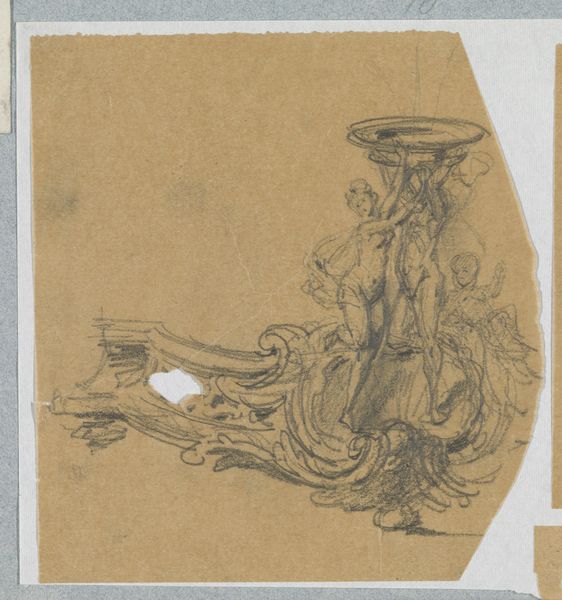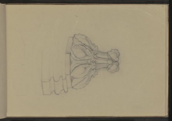 Curator: The tentative, ethereal quality of this drawing strikes me immediately. There’s a ghostliness to it, a sense of something being captured fleetingly. Editor: Indeed. What we're seeing is "Kapiteel met bladmotief," a pencil drawing on paper by Pierre Joseph Hubert Cuypers, dating from around 1837 to 1921. It currently resides here at the Rijksmuseum. Cuypers, as many know, played a significant role in the Gothic Revival in the Netherlands. Curator: Knowing that, I’m suddenly aware of a tension in this image. On one hand, the naturalistic leaf motif seems to strive for an organic fluidity associated with Art Nouveau; yet, that geometric structure underlying the leaves suggests something much more rigid, almost…oppressive, recalling the imposing nature of some institutional spaces that employed those neo-Gothic forms. Editor: An interesting observation! To me, the botanical element connects strongly with long-standing traditions that imbued specific plants with symbolism. Think of the acanthus leaf, a persistent motif in classical architecture representing endurance and immortality. Are we perhaps seeing Cuypers engaging in that very same type of visual language—but rendered in the dawn of modernism? Curator: It makes me think about architectural spaces as sites of power and the ornamentation deployed to normalize it. Consider how ornament often served to obscure the labor involved in its creation, reinforcing a false sense of effortless grandeur for those in positions of authority. Was Cuypers simply perpetuating the status quo or perhaps subverting it, acknowledging the changing sociopolitical landscapes? The contrast between botanical naturalism and geometric structure invites precisely this sort of interrogation. Editor: Fascinating. And consider the unfinished aspect of the drawing; a possible insight into the mind of an architect struggling to reconcile tradition and a new visual vernacular. The persistence of vegetal motifs reflects something fundamental in the human spirit, linking us across centuries through this silent visual code. Curator: This prompts contemplation on power dynamics embedded within architectural design, reminding us that what may initially seem as simply decorative, like this ornamentation, frequently acts as a powerful tool for social inscription and reinforcement of dominant ideologies. Editor: Thank you, it seems the drawing presents far more than just leaf design, revealing deeply rooted cultural memory.