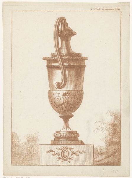 Editor: So, this is "Drie antieke vazen op sokkel," or "Three Antique Vases on a Stand," potentially from 1779, by F. Begbie. It's an engraving and gives off this distinctly old, almost sepia-toned feel. The vases look like they're styled after the antique, like the text says, but the image itself, especially the central vase with figures, feels ornate, maybe even playful. What cultural ideas can we draw from this design, that blends these ancient and playful aesthetics? Curator: It's fascinating how Begbie engages with the past, isn't it? These aren’t simply vases; they're vessels of cultural memory. Consider the Neoclassical style, which draws heavily from ancient Greece and Rome, aiming to revive their perceived ideals of order and reason. These vases echo a yearning for that lost golden age, but infused with a new decorative sensibility, more florid, what stories do you imagine the imagery narrates, given that interplay between "ancient" and "antique?" Editor: That's a great point. So the figures on the central vase, they’re almost cherubic, a lighthearted contrast to the more austere shapes of the vases themselves and those surrounding it. And I see the inclusion of what look to be swags and medallions -- not things you might typically associate with severe, classical forms. Curator: Precisely! These details tell us so much. Begbie uses a symbolic language here. The cherubic figures suggest innocence, playfulness. The swags and medallions represent abundance and prosperity, popular themes of that period. What does this combination of elements, the old and the new, whisper to you about the cultural mindset of the time? Editor: It sounds like a way to ennoble wealth, to wrap it in the legitimacy of the classical past but while embracing this era's unique aesthetic flair and fondness for excess. A display of sophistication with a sense of humor! Curator: Exactly! Begbie’s engraving isn’t just a decorative print; it’s a lens through which we can observe the evolving tastes and cultural values of the late 18th century. This combination tells us a lot about how societies redefine the legacy of antiquity to serve their evolving cultural stories. Editor: I never would have considered the cultural significance of swags before! Thanks!