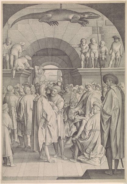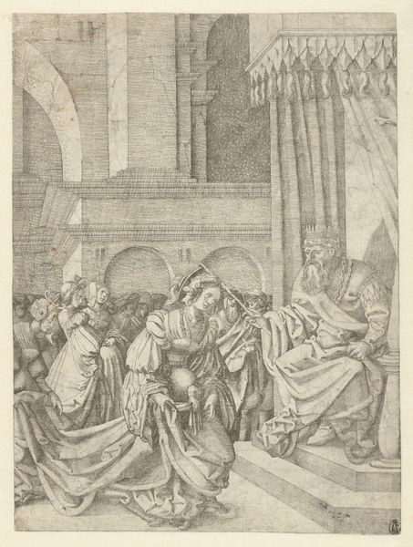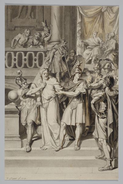 Editor: Here we see "The Martyrdom of Saint Symphorien" by Jean Auguste Dominique Ingres. It's quite a detailed drawing, and the scene feels charged with tension. What strikes you when you look at this work? Curator: It's compelling how Ingres uses established visual language for martyrdom. The angel watching from above—what does that signify for you? It's a potent symbol, isn’t it, connecting worldly suffering to divine acceptance. Editor: It makes me think of salvation. But what about the symbols of Roman authority, like the soldiers and architecture? Curator: Exactly. They represent earthly power, but they're ultimately ephemeral compared to the spiritual realm symbolized by the angel. This contrast is a powerful commentary on faith enduring despite oppression. Editor: It’s interesting how he uses symbols to explore that tension between power and faith. Curator: Indeed, this piece reminds us of how visual symbols shape our understanding of history and belief.
