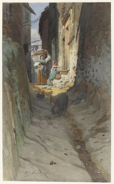 Editor: This is Wilhelm Marstrand's "A Stout Roman Woman Being Helped onto a Donkey," painted sometime between 1835 and 1873. The scene has a kind of warmth to it, despite the earthy tones. It looks like a genre painting. What draws your eye in this work? Curator: It whispers a story, doesn't it? The stout woman, the attentive helper, the quiet child... For me, it's the undercurrent of everyday life, the unglamorous reality of travel, rendered with such tenderness. Notice how Marstrand doesn't shy away from portraying the woman's weight; instead, he celebrates her humanity. He asks us to look beyond superficial beauty and find value in the ordinary. Have you noticed the subtle theatricality of the composition? Editor: Yes, there's definitely a posed quality. I hadn't considered how he 'celebrates' her humanity; it's very painterly, especially if this can be categorized as realism. Curator: Exactly! It's a realism tinged with romanticism – a potent combination. Marstrand elevates the everyday to something worthy of our attention. Do you think the donkeys symbolize anything? Perhaps the burden we all carry, lightened by human connection? Or maybe he just liked painting donkeys. It might be the human and animal presence of this artwork that draws my gaze, a shared gaze. Editor: Maybe both! Now, I find myself wondering about the donkey's perspective. What would a donkey art critic say? Curator: Ha! Probably that we should all slow down and appreciate the simple pleasures, like a good patch of grass. This has been so helpful. Editor: I definitely learned a lot too! It is nice to wonder from whose perspective we appreciate art and the beauty they hold. Thanks.