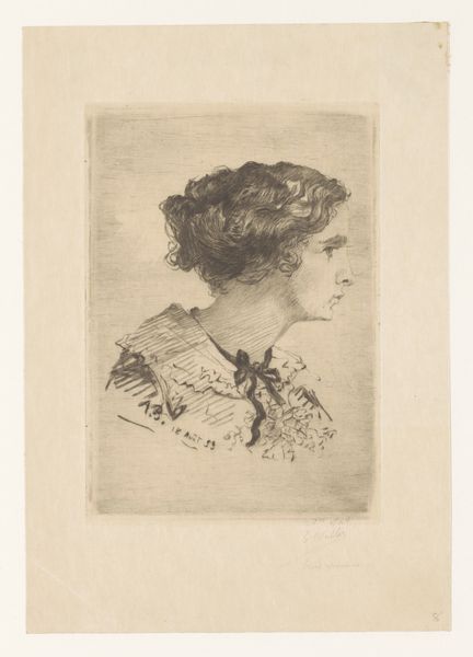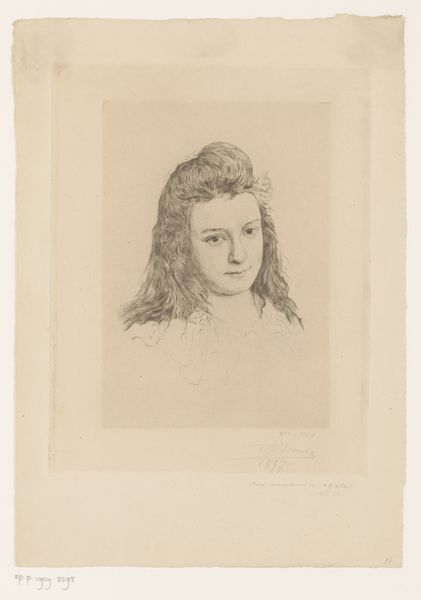 Curator: Looking at "Portret van een onbekend meisje", made by Piet van Engelen likely between 1873 and 1910, rendered beautifully in pencil. It captures the essence of a young girl. What are your first impressions? Editor: Melancholy. It’s the gaze, isn't it? Those eyes tell a story, even if we don't know what it is. The softness of the pencil work only enhances the feeling; it’s almost like a memory fading. Curator: That feeling speaks volumes about how portraits functioned, particularly in this period. They often weren't just about representation, but memorialization, social standing, sometimes even idealized notions of youth and beauty that reflected societal values. This young woman would have had her likeness immortalized, so to speak. Editor: Immortalized, but still anonymous, right? There’s a potent irony there. I imagine her perhaps dreaming of escaping whatever role was set for her, searching for something beyond the frame. That soft hair especially… it feels unbound, contrasting the potential rigidity of her position. Curator: Interesting interpretation! What you're picking up on aligns somewhat with the artistic trends emerging around the turn of the century: Realism's attempt to show the individual without the aristocratic fanfare. Artists sought authenticity, but were still products of their time. How accessible would art depicting raw emotion truly be when constrained by Victorian social mores? Editor: True, a constant tension! This pencil almost seems to whisper those societal demands while it captures her resistance to them. Think about what happens *outside* the edges of this restrained, carefully composed image. Was she playing the piano or helping her mother sew before she was commanded to pose for her portrait? Was she sneaking out to read a romance novel or to climb trees when nobody was watching? I imagine someone ready to break free. Curator: And in the end, perhaps that tension makes the work resonate. The very act of creating a portrait places the subject within the societal structures while also allowing us, generations later, to project our own meanings onto it. It's an historical artifact and a stage for our own feelings and social questioning. Editor: Precisely. It's not just *her* portrait. It’s a mirror reflecting who we are now, and what we still hope to see. That quiet resistance still calls out to us.