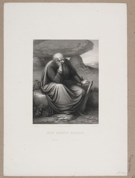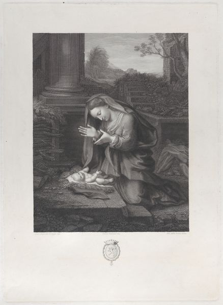 Curator: Before us is "Virgin Adoring the Child" by Vincenzo Della Bruna, an Italian artist active in the 19th century. Editor: It's predominantly grayscale. The Virgin's posture is so reverent, almost like a soft, focused light is emanating from the child. Curator: Della Bruna created this during a period of intense religious revival. Such imagery reinforced social norms surrounding motherhood and piety. Notice the classical architecture in the background. Editor: Yes, the column contrasts with the natural setting. The textures are so delicate, especially the fabrics and soft skin; this fine detail really directs the eye. Curator: Absolutely. The artwork served a didactic purpose, reminding viewers of the virtues of humility and devotion that were so cherished then. Editor: Looking at the tonal range, it's the contrast between light and shadow that pulls me in, highlighting the emotive core of the scene. Curator: It gives insight into how art served as both a spiritual and social tool. Editor: I appreciate how the artist's technique helps shape our perception of the scene.