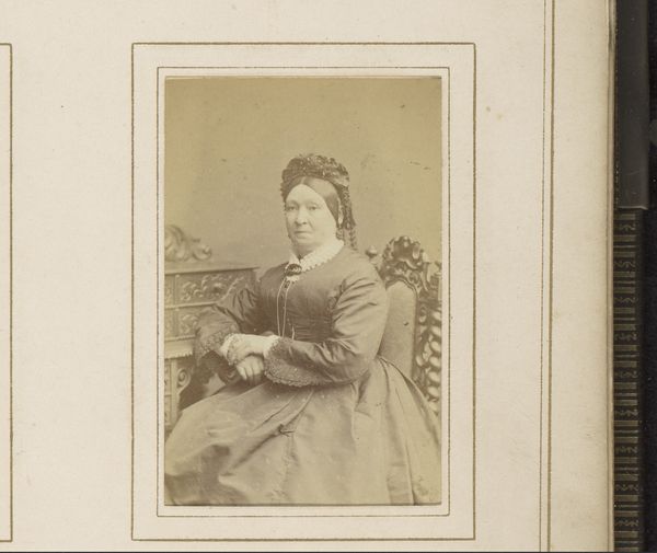 Carl Rensing made this portrait of a seated woman with a bonnet and ribbons, likely in the Netherlands, where he worked. The image speaks volumes about the subject's social standing and the conventions of the time. Her attire, particularly the bonnet and ribbons, signify adherence to cultural norms and perhaps hint at a specific religious or regional identity. The formality of the pose, the subdued tones, and the careful arrangement of clothing all contribute to an image of composed respectability. Photography in this period served as a tool for constructing and reinforcing social hierarchies. Portraits were often commissioned by families to document their status and lineage. By studying costume, photography archives and local histories, we can learn more about how this woman and her family positioned themselves within Dutch society. Consider the role of the Rijksmuseum itself as an institution that collects, preserves, and interprets such images, shaping our understanding of the past.