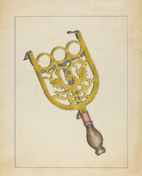 Curator: We're looking at "Painted Bellows," a watercolor and pencil drawing by Ella Josephine Sterling, created around 1936. Editor: Oh, it’s…quaint, isn't it? A burst of warmth preserved in strokes of watercolour. Feels like stumbling upon a cherished, handcrafted object. Curator: Indeed. I see it as an excellent example of domestic craftsmanship elevated to an art form. Sterling’s piece emphasizes the material culture of her time by highlighting a functional object – the bellows – that’s been ornamented. Editor: I love how the decorative floral elements pop against that buttery yellow, but look closer: it's just… wonky. The asymmetry gives it character though; a bit like finding a lopsided grin unexpectedly charming. Curator: The construction methods of such objects always intrigues me. We can see evidence of hand tools and crafted joins throughout, which tell stories about the community from which the art has emerged and of an industrial context beginning to impinge on its design and utility. Consider the materials themselves: wood, metal, paint – all locally sourced. Editor: See, that grounded quality appeals to me too, but it also sets my imagination off. I picture someone lovingly painting those tulips, bringing a personal touch to something purely utilitarian. It becomes a small act of rebellion against the mundane. Curator: I appreciate that perspective. I see the bellows as both a decorative piece and a functional item essential in any fireplace setting, and by immortalizing that it is in effect honoring the work required for keeping homes and industries functioning. The act of creation being almost indistinguishable from a productive industry, rather than fine art for its own sake. Editor: Perhaps she's suggesting the mundane, that necessary grunt work, *is* beautiful, and that imbuing any practical object with creativity can be transformative. Curator: Certainly a possibility. It invites reflection on value—artistic, utilitarian, and even emotional. Editor: I agree completely. What initially appeared straightforward offers, upon further reflection, so many hidden and fascinating pathways of understanding!