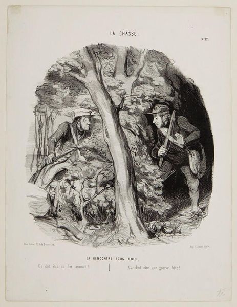Curator: "The Hunt on Water" by Honoré Daumier depicts a rather dismal hunting scene. What do you see in this satirical lithograph? Editor: It looks like Daumier is poking fun at the leisure activities of the bourgeoisie. The hunters seem more miserable than majestic. What's the story here? Curator: Daumier often used his art to critique the social inequalities of 19th-century France. How does this image function as a commentary on class and privilege? Editor: Maybe the artist is trying to point out how the upper classes can afford leisure even in unpleasant conditions, while others are just trying to survive. Curator: Exactly. And by emphasizing the discomfort, he humanizes those who might otherwise be seen as distant or superior. It makes us question who truly benefits from these societal structures. Editor: This piece really made me think about how artists can use humor to expose social issues. Curator: Indeed. Daumier's work encourages us to consider whose stories are being told and whose are being overlooked.