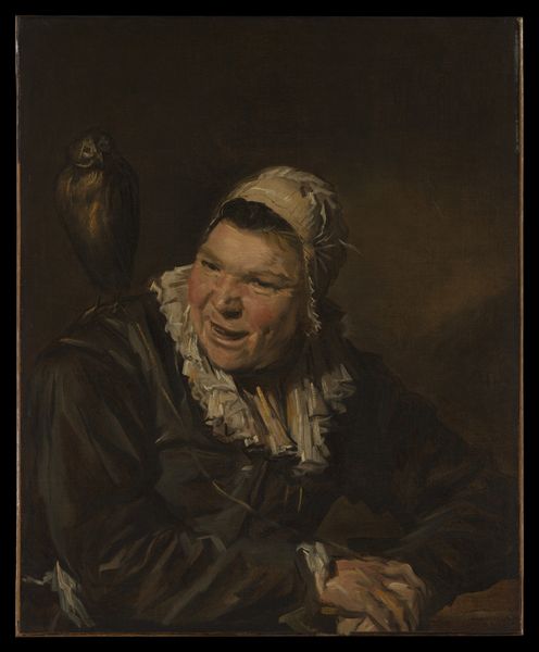 Editor: This is Hendrick Bloemaert’s "Old Woman Selling Eggs," painted in 1632 using oil paint. There's something so captivating about the way the light illuminates her wrinkled face. What initially grabs your attention when you look at this piece? Curator: Immediately, I observe the structural interplay between the stark simplicity of the egg and the intricate texture of the old woman's skin and clothing. Note how Bloemaert uses contrasting light and shadow to define form, creating a tangible sense of volume. Consider also the semiotic weight of the egg itself: a symbol of potential, fragility, and sustenance. Editor: It’s interesting how the ordinary is elevated through such careful composition. The way she’s examining that egg, it seems to say more than just an appraisal of merchandise. Do you see a narrative here? Curator: Perhaps. But a Formalist reading prioritizes the inherent visual language. Observe the pyramidal structure—the head and hand with the egg form the apex, grounding the gaze. Also consider the limited palette; earth tones lend a solemn, almost contemplative mood. The artist's intent, narratively speaking, is secondary to how form creates meaning. Are you not drawn to the texture of the fabrics in contrast to the smoothness of the egg? Editor: I do see what you mean about the textural contrast now. It is compelling how such simple elements come together. It also makes me appreciate the attention to detail despite the ordinary subject matter. Curator: Exactly. We see how through skillful manipulation of form and material, Bloemaert has created something significant from the commonplace. Editor: I think I will start paying a lot more attention to the construction of a painting instead of jumping straight to the narrative! Thanks!