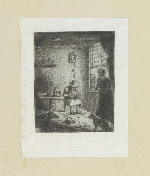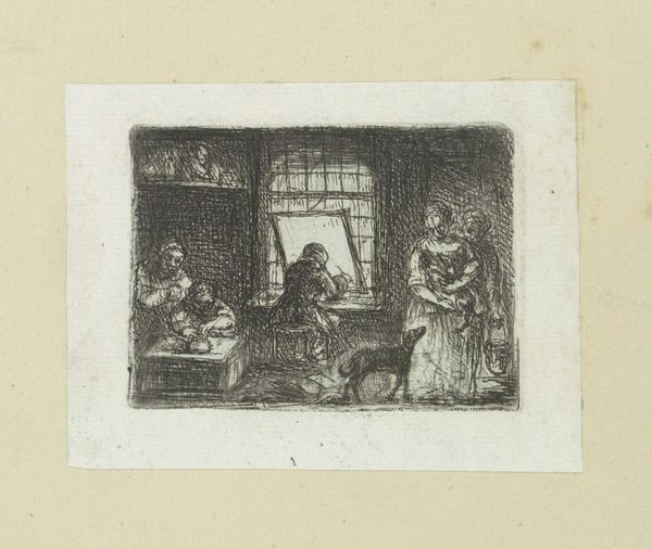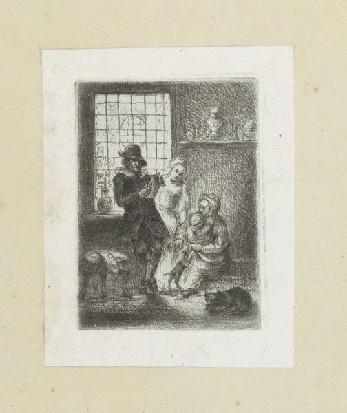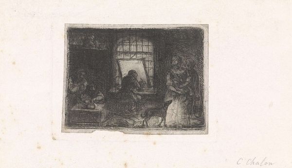 Jan Chalon created this print, titled "Family by the Window," in the Netherlands during the late 18th century. Notice the intimate domestic scene, illuminated by the window and a central candle. What does it tell us about the social conditions of the time? The presence of a family suggests societal values placed on domesticity and familial bonds. But the etching also hints at the economic realities of 18th-century Dutch life. The family's modest attire and the sparse interior suggest a middle-class existence, a far cry from the opulence enjoyed by the elite. This image enters into a longer history of Dutch genre painting, associated with artists like Rembrandt and Vermeer. Chalon's print partakes in that tradition, but it also subtly comments on the changing social landscape, as a new era of revolution was about to begin. To understand this artwork further, we might consider how 18th-century Dutch society viewed family life and economic status. By delving into such historical and cultural contexts, we gain a richer appreciation of art's role in reflecting and shaping social norms.