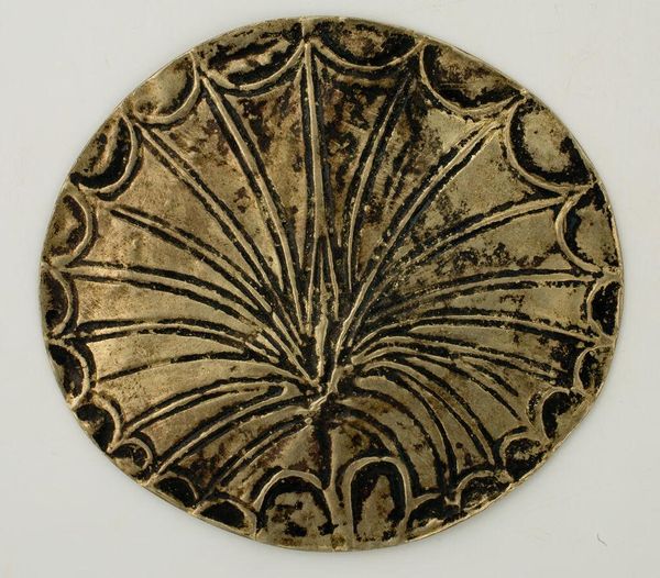 Editor: Here we have a reproduction of a Gold Mycenaean Disc, likely by Emile Gilliéron or his son. It’s quite small, only about 5 centimeters across. The circular patterns make me feel a bit dizzy! What do you make of this piece? Curator: The dizzying effect is interesting, isn’t it? I see it as a microcosm of the universe, those spirals echoing constellations, or maybe even the swirling depths of our own minds. It is easy to project grand ideas onto such an object, knowing it was precious enough to be reproduced. Editor: So, even a copy can carry the weight of the original's purpose? Curator: Absolutely! It reminds us that even echoes can resonate with the truth and beauty of the past. Editor: That’s a really beautiful way of putting it, I learned a lot.