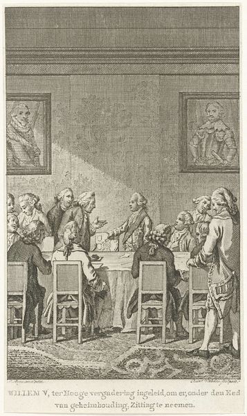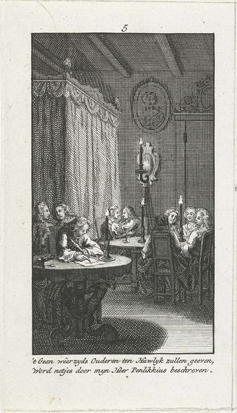 This engraving, "Women Visiting After Childbirth," was created by Jan Caspar Philips. The intricate details of the scene draw us into a domestic interior filled with social exchange. The composition is structured around a central table, around which women gather in various states of engagement. Philips uses the strict lines of the architecture and furniture—notice the towering cabinet and gridded windows—to frame the softness of the figures, creating a tension between the order of the domestic space and the lively interaction of the women. The text inscribed at the bottom, divides social classes, positioning the women within a specific cultural context. Philips asks us to consider the semiotic interplay between image and text. The precise engraving technique enhances the sense of detail. It invites a decoding of social structures and class distinctions in 18th-century domestic life. The artwork encourages us to reconsider the relationship between material culture, social behavior, and artistic representation.