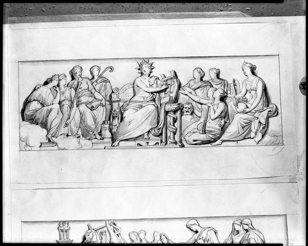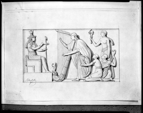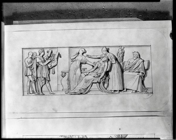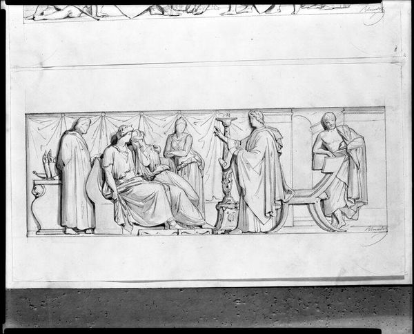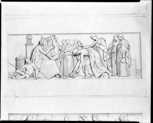 Curator: This drawing, titled Ossian, comes to us from Merry Joseph Blondel. Editor: There's a somberness to the work, even in monochrome. It looks like a classical frieze, but infused with this otherworldly melancholy. Curator: Blondel worked during a time of renewed interest in classical forms. The piece is rendered with a level of precision indicative of the artist's academic training. The artist's use of line and shading really directs the viewer's gaze. Editor: Absolutely. It’s a reflection of its historical moment, where myth served as a powerful tool for constructing identity and exploring themes of loss and heroism, especially with the warriors standing guard. We see the romanticisation of masculinity. Curator: It's fascinating to see how Blondel engaged with the artistic conventions of his time. He clearly mastered drawing as a key element of the artistic process. Editor: Right, it's a study in how art can serve as a mirror and a lamp—reflecting cultural values and illuminating universal experiences. Curator: Indeed, a beautiful piece to consider the impact of classical techniques. Editor: Definitely food for thought about the interplay of identity and representation.