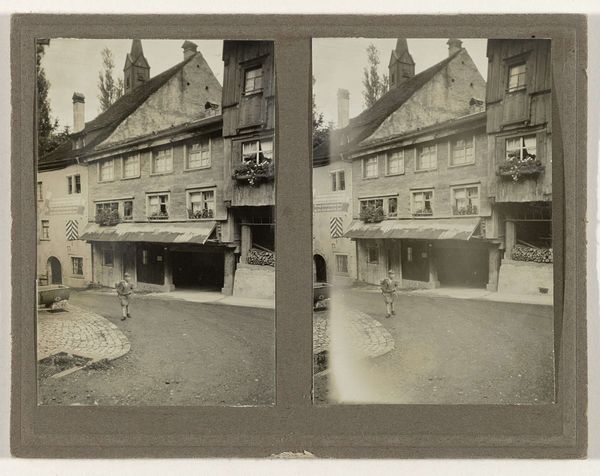 Curator: Looking at this striking image, what's your initial response? Editor: A somewhat melancholic scene. The subdued tones lend the photograph an air of faded grandeur. There is something about the linear perspective and the geometrical layout that hints at photographic skill, combined with architectural knowledge and design. Curator: This is "Groep op de balustrade van een woning," or "Group on the Balustrade of a House," believed to be captured sometime between 1920 and 1945, created by Geldolph Adriaan Kessler and currently housed in the Rijksmuseum. I am intrigued by the presence of this unnamed "group." They could represent the landed gentry, secure behind stone walls, caught on the precipice of an epochal shift. It’s like a moment of suspended animation between world wars. Editor: That interpretation gives historical and sociological grounding to this photograph; however, let’s not overlook the artist's treatment of light and shadow. The building’s stark geometry stands against a soft, overcast sky, blurring depth perception, whilst simultaneously creating a harmonious tension and contrast. I also detect how the balcony railing intersects and interacts, delineating distinct, although perhaps partially blended, spaces for a population of human figures. Curator: Indeed, the visual contrasts emphasize socio-economic differences; while there are those of colour, class, and gender. The composition suggests an interrogation of power dynamics through this lens. Where might those located in a place such as this one have occupied in society, during the first half of the twentieth century? Who was permitted entry? To what social strata did the residents, workers, visitors and managers belong? The photographer forces viewers to question social access through this structural photograph. Editor: Undoubtedly, but without an appreciation of composition or technical processes, these questions become speculative assumptions, disconnected from how visual design determines meaning. Curator: Fair enough. Viewing it through your lens is just one step in unpacking layers of meaning related to broader narratives concerning place, belonging, exclusion, and legacy. Thank you for that perspective. Editor: And, similarly, thank you. Your considerations ensure it isn’t merely an aesthetic experience, encouraging us to look closer and deeper, even if not to always find easy or reassuring conclusions.