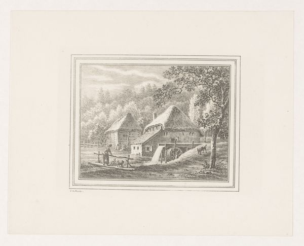 Editor: So, this is Ferdinand Kobell’s "Miller at the Door of a Mill," undated, and it feels like peering into a quiet, bustling world. What details catch your eye in this print? Curator: For me, it's the contrast between the detailed foliage and the almost cartoonish figures. It’s as if Kobell is saying nature is real and permanent, but people are just passing through. Editor: That's beautifully put! I hadn’t considered how he juxtaposes those elements. Curator: He also includes some dark humor, perhaps. The miller is forever stuck at his mill, while nature continues to thrive independently. What do you think he's trying to suggest? Editor: Maybe it's a reminder of our small place in the grand scheme, a nudge towards humility. It’s much more complex than I first thought. Curator: Exactly! And isn’t that the magic of art?
