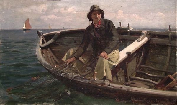 Editor: This is "Fiskerbarn Chiemsee," an 1867 oil painting by Hans Gude. I'm immediately struck by the stillness of the scene; a couple of young people are sitting quietly in a boat on a calm lake. What symbolic weight do you think this work carries? Curator: This painting is deceptively simple. Water often represents the unconscious, the source of life, and in some traditions, purification. The two figures in the boat… what roles do they inhabit? He tends the net, a clear, almost patriarchal role of provider, while she rows, connecting them directly to the water, almost an earthly link. Editor: So you see them as representing different aspects of human experience? The active and passive, perhaps? Curator: Indeed. The hat on the boy reminds me of traditional Bavarian dress; clothing often roots identity. But beyond region, the net becomes incredibly significant. It's a tool of acquisition, yet inherently open, empty until filled. Is it about what they hope to capture, or the act of hoping itself? What is Gude suggesting through that juxtaposition? Editor: That makes me think about the background. It's very idyllic, very peaceful. Does it reflect the figures' internal states or perhaps contrast with them? Curator: Exactly. The backdrop speaks of a stable, abundant world. But observe how the colors become more muted as you move away from the foreground figures, and that the only sign of civilization is a boat way off in the background. Perhaps that lack of color and activity reveals a yearning for elsewhere? An idealized life, or one long gone? These figures are both *in* the world but also seemingly removed from its immediate vibrancy. Does this inspire reflection on our own pursuits, what is kept versus what is left behind? Editor: I hadn't considered that before. Seeing the painting as more of an introspective piece, rather than just a snapshot of everyday life, really changes my perspective. Curator: Symbolism invites endless questions. That is why revisiting them over time is valuable.