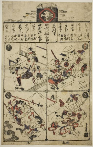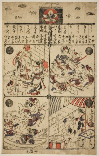 Editor: This woodblock print, “Shirasuka en Futagawa,” was created around 1860 by Utagawa Yoshiiku. It feels a bit chaotic, with figures in both the upper and lower registers in moments of conflict or surprise. What do you see in this piece, looking at it through a Materialist lens? Curator: Let's consider the means of its production. This ukiyo-e print involved a complex division of labor. An artist designed the image, but specialized woodblock carvers meticulously transferred the design onto woodblocks. Then, printers applied ink and carefully pressed the paper to create the final product. The materiality of the print—the paper, the ink, the wood itself—tells a story of a commercial industry catering to a growing urban population. Do you notice anything about how that process might relate to the subject matter here? Editor: Hmm, I guess that while these individual scenes might depict local events, their being part of a wider, reproducible set of images speaks to wider market and consumption. Curator: Precisely. Furthermore, the very act of mass-producing images democratized access to art and information. Ukiyo-e prints brought scenes of daily life, landscapes, and popular culture to a broader audience, impacting social values, knowledge, and identities of ordinary people. Think about what it means for people to have ready access to these images of squabbles in their towns? Editor: So, it’s less about the individual artistic vision and more about the whole system of creation, distribution, and consumption and the kind of impact the images had on everyday lives. Thank you for providing that new lens on art! Curator: Indeed! By examining the process of production, circulation, and reception, we gain deeper insights into the cultural work these objects perform. It's a powerful way to engage with art.