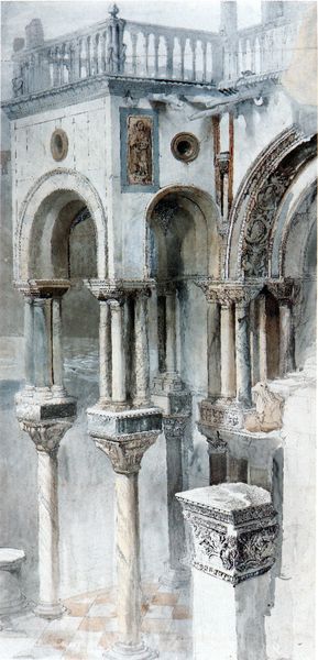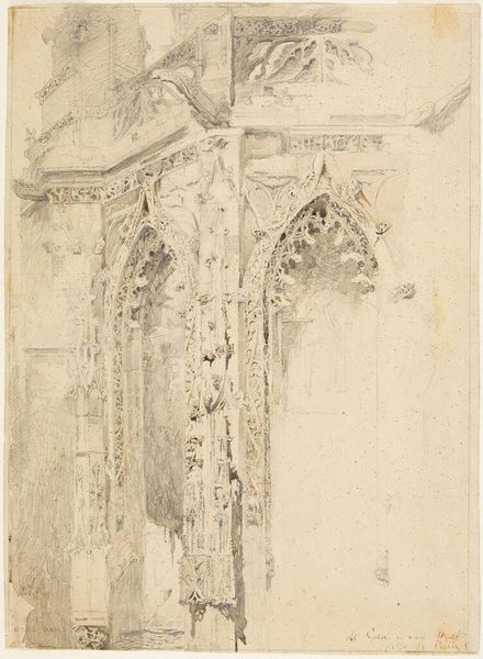 Editor: Here we have John Ruskin’s “Caen St Sauveur” created in 1848 using charcoal. It looks like a section of a gothic cathedral. The intricacy of the architectural detail, all in monochrome, creates this solemn and almost ghostly effect. What draws your eye in this piece? Curator: My gaze is immediately caught by the lace-like gothic arches. Think of the arch as a symbol—a threshold, a portal. What psychological space does this drawing invite us to enter? Is it a space of reverence? Perhaps even a memorial? Editor: A memorial? That's an interesting take. It feels more like documentation to me. Curator: Documentation, yes, but even documents can become memorials. Ruskin was deeply invested in preserving architectural heritage through his drawings. Consider the cultural context: 1848 was a year of revolutions. How might this drawing be an act of preserving memory against potential destruction? What kind of visual language can persist, despite physical structures that may crumble? Editor: So, the act of drawing itself becomes a form of preservation, a way of keeping cultural memory alive. The symbol becomes the building in a way? Curator: Precisely! Notice how the charcoal captures not just the shape, but the texture, the *feel* of the stone. It evokes a sense of timelessness and solidity. Look at the ornamentation. What might the floral motifs and pointed arches have symbolized to those who built this cathedral? What do they convey to us today? Editor: That connection to historical context really opens it up. I was focused on the immediate visual, but the symbolic weight adds so much more. Curator: Visual art invites that journey of interpretation. Hopefully now, listeners may bring this symbolic awareness to similar forms, experiencing and understanding our visual world with greater depth.