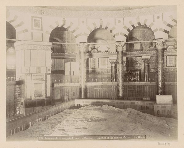 Editor: This albumen print, "Mosque d'Omar" by Félix Bonfils, dates back to the 1870s. I'm struck by the rich textures and the almost tactile quality of the stone surfaces. It feels very weighty, very permanent. What jumps out at you? Curator: Considering it as a materialist, I immediately look to the conditions of production: Bonfils, a Western photographer, traveling to Jerusalem in the 1870s. The very act of capturing this image—transporting the equipment, preparing the albumen prints, negotiating access—speaks volumes about colonial power dynamics and the commodification of cultural heritage. What materials would he have had to procure, and what were the labor conditions for such a task? Editor: That's fascinating, I hadn’t thought about the sheer logistics of creating this image. The albumen print process itself seems pretty complex, and labor-intensive. Curator: Precisely! Think about the process. Albumen, derived from egg whites, painstakingly coated on paper. Sunlight harnessed as the primary means of fixing the image. How does the material reality of its production, that labor, shape its meaning, and ultimately, its value as both a document and a work of art? The tones highlight the materials used for the Mosque. Editor: So, it’s not just about the artistic eye, but also the economic and social forces at play in producing this specific kind of image? Curator: Absolutely. And what does the popularity of such images reveal about European consumption of the "Orient" at the time? It satisfies a demand, creating a visual shorthand for a complex place. Think also about access, who gets to see it in the West compared to locally? Editor: I'm beginning to see how focusing on the materials and their production opens up entirely new layers of interpretation. I appreciate how you draw attention to the labor, materiality, and consumption intertwined within this photograph. Curator: Glad to have offered an alternative perspective. The materiality always offers critical insights into history.