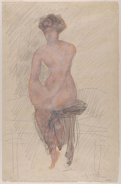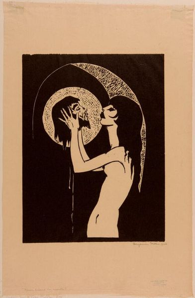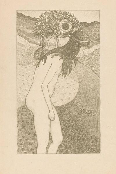 Editor: Here we have Koloman Moser's 1897 ink drawing, a sketch for an illustration titled "Allegory of Ver Sacrum." The upward reaching figure really grabs my attention. What do you see in this piece, focusing on its visual elements? Curator: Consider the composition: the verticality is emphasized, drawing the eye upwards, bisected by the figure. Note the contrast between the light figure and the dark background, and how this tension adds drama. Then look at the figure itself. What do you observe? Editor: The lines are delicate yet strong. The woman appears almost ethereal, but there's also a sense of power in her reaching pose. And the tree above her...it seems almost to weigh her down. Curator: Precisely. The intertwining branches, those dense blooms – they are rendered with meticulous detail, and this intricacy stands in sharp contrast to the relative smoothness of the figure. Is the symbolism apparent? The nude figure actively participates in her arboreal immersion. The limbs of the model become one with that from which her limbs arose. Consider how Moser masterfully uses line and form to explore the burdens and ecstasies of youthful renunciation, embodying renewal in his style and design. Editor: So the interplay between the figure and the dense foliage contributes to this symbolic weight you describe? Curator: Absolutely. It's a carefully constructed visual dialogue. Also, observe the stylized lettering at the bottom. "Ver Sacrum" - Sacred Spring. Its angular design complements the Art Nouveau style overall. Editor: That connection makes the image even more coherent and insightful. I had initially thought that the upward reaching of the figure signified freedom. Now I see how the image, while formally quite elegant, expresses the concept of renunciation to the past. Curator: Precisely, we can appreciate the way its composition, forms, and lettering interact with one another to produce such powerful content. It goes to show how the visual language can often convey much more.