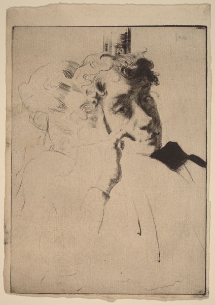 This is a self-portrait by Marc Chagall, created using etching, a printmaking technique that relies on skilled metalworking. The plate is made of copper or zinc, and the artist would have used acid to bite into the surface, creating lines that hold ink. The fine lines and subtle gradations of tone speak to the artist’s control over the etching process. Look closely, and you'll see how the quality of the line varies, creating depth and texture. This wasn’t a quick process; it required careful planning, skilled execution, and multiple stages of proofing and printing. Now, consider the social context. Printmaking has a long history of democratizing images, making them accessible to a wider audience. While Chagall was certainly an established artist when he made this print, the medium itself suggests a desire to connect with a broader public. Ultimately, understanding the labor and techniques behind this etching helps us appreciate Chagall’s artistry in a new light.