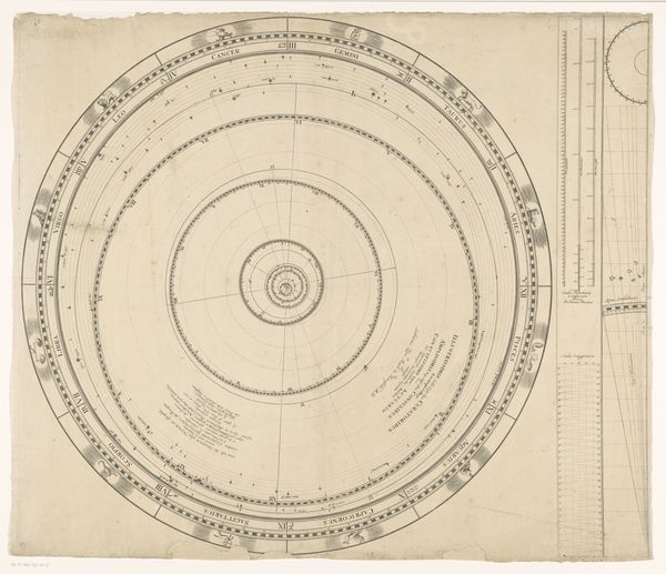 Curator: Let's consider this print, "Placement of the Earth in the Zodiac" by Sébastien Leclerc I, made in 1706. The medium is engraving on paper. Look closely at the meticulous lines used to construct the celestial diagram. It’s interesting to observe how Leclerc employs printmaking – a method readily available, and infinitely reproducible – to disseminate understandings about the cosmos. Editor: Yes, I notice the geometric precision. What's particularly fascinating to me is that Leclerc is trying to explain this huge idea of Earth’s place in the universe through such careful, controlled labor. What else do you see? Curator: Think about the paper itself, a common, commercially available substance, acting as the very foundation upon which scientific and religious beliefs are spread. Printmaking allowed knowledge – be it accurate or flawed by modern standards – to transcend aristocratic circles and enter the realm of public consumption, influencing how a growing populace comprehended their place within the grand cosmic architecture. It’s a stark contrast, the mass production of prints juxtaposed against the unique wonder of space! Editor: I see, so the very nature of this work, how it's made, makes a statement about how ideas were spread then. Curator: Exactly! Consider the engraving process—a skilled craftsman painstakingly incising lines into a metal plate, essentially mass-producing 'truth.' This engraving shows us more than just astronomy; it shows us how information and power circulated. It bridges the gap between 'high' science and everyday life via its chosen medium. Do you think this piece might make one question the traditional divide between art and craft? Editor: That's a really interesting perspective. I never really considered the class implications of the piece. I’ll definitely look at engravings differently now, keeping in mind their cultural influence. Curator: Precisely. By recognizing its materiality and the labor involved, we grasp a more complete understanding of its original function and ongoing influence.