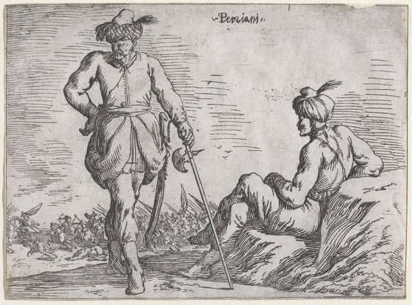 Curator: Pieter Nolpe's engraving, "Dancing Farmer and Wife," probably created sometime between 1623 and 1653. It depicts a rural couple mid-dance. Editor: Well, they certainly look like they're enjoying themselves! There’s a definite looseness, almost a drunken quality, to their movements. Curator: Absolutely, there's an exuberant freedom conveyed by Nolpe’s scratching technique, as if capturing the immediacy of a lively folk dance. Editor: And notice the tools of their trades that are dangling from her apron? It makes you wonder what kind of labor they’re leaving behind for this bit of leisure, and where they found the material resources for celebration. Curator: Perhaps Nolpe intends to highlight a specific element within Baroque themes of excess or pastoral idealism. I perceive them existing outside urbanity and formality, free from the constraints. Look at his jaunty cap and her lit pipe, small rebellions within their roles! Editor: That’s a fascinating read. I see the details not just as symbols, but as integral components of their lived reality—their very beings are defined by labor and simple pleasure. The print, an accessible medium, turns their commonplace celebration into a commodity, capturing and potentially mythologizing their working class experiences. Curator: You propose an interesting dimension. Could Nolpe be intentionally using this genre painting as an invitation to reconsider society, and perhaps a gentle prodding at our perception of art and value? Editor: Exactly! The accessibility of prints makes them a democratic medium. These works allowed ordinary folks, like the couple represented, a form of artistic representation that might otherwise have been unavailable. Curator: Looking again at how freely Nolpe etched his lines, it reinforces the theme of a life unbounded, however brief the escape, within a material reality as you remind me. Editor: And thinking of all the impressions made from the engraved plate…all the hands it would have passed through... fascinating! It gives us so much to think about concerning representation and how art reflects—and affects—society.