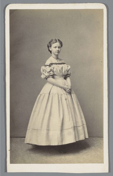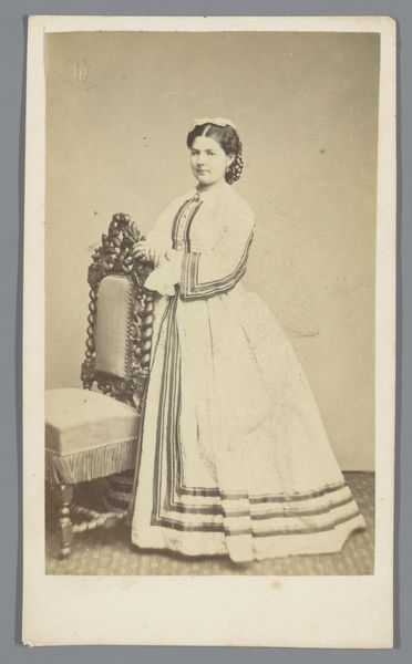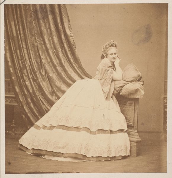 Editor: Here we have a portrait of an unknown woman, taken sometime between 1855 and 1885, by Johann Schäfer. It's a photograph, a medium which I find so revealing. She looks so contained, almost like a doll in her expansive dress. What do you see in this image? Curator: I see a woman positioned within a rapidly changing socio-political landscape, carefully constructing her public persona. Photography at this time offered a novel, though not entirely accessible, form of self-representation, especially for women. The question is, how much agency did she truly possess in the making of this image? Editor: Agency? Could you expand on that? Curator: Think about it: Who controlled the studio, the equipment, the narrative? Was this portrait intended for personal use, or as a statement to a wider social circle? Consider the visual codes of the dress itself—its size and ornamentation speak to certain expectations of femininity and class. Are these embellishments empowering or restrictive? Editor: I hadn't considered the layers of potential influence on something that seems so straightforward. Do you think the gaze of the woman can inform some agency, then? The directness of the portrait suggests she wanted to be perceived in a certain way. Curator: Exactly! The subject's gaze and posture become tools. Despite the constraints imposed upon her, she actively participates in shaping her own narrative. Perhaps this image becomes a quiet act of self-assertion within the confines of her era. Editor: That really changes my perception. I initially saw a static portrait, but now it seems much more dynamic and complicated. Curator: It highlights how art can simultaneously reflect and subvert social norms, prompting us to continually question established narratives. Editor: I learned so much from diving deeper into its socio-historical elements; I appreciate the perspective.