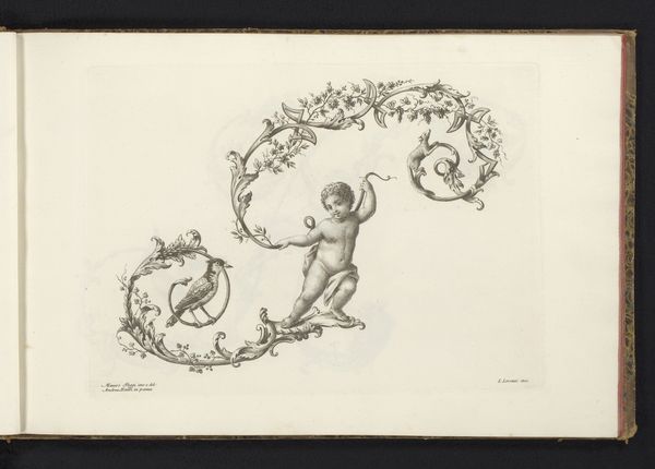 Editor: So, here we have Lorenzo Lorenzi’s pen and ink drawing, "Ornamentele letter E," dating from 1745-1765. It’s housed in the Rijksmuseum. I’m really struck by the playful combination of the natural and the decorative, almost as if the flora and fauna are collaborating to form this elegant letter E. How do you interpret this work, especially considering its historical context? Curator: It's precisely that tension – or perhaps harmony – between nature and decoration that captivates me. Think about the Baroque period when this was made. It was a time obsessed with elaborate ornamentation, projecting power and status. The stylized animals and foliage, forming a letter, speaks volumes about the artificial manipulation of the natural world to serve aristocratic needs and display the human mastery. Do you see any irony in how nature is being both celebrated and constrained? Editor: That's a really interesting point! I guess I hadn’t considered the power dynamics at play. I was just focused on the aesthetics. Is there something inherently political in that type of ornate style? Curator: Absolutely! Ornamentation often acts as a visual shorthand for wealth, privilege, and control. Consider the use of animals, commonly depicted as noble, their wildness domesticated into emblems of authority. Ask yourself: Who is controlling this representation, and to what end? How does this compare to contemporary debates about ownership, both of land and of image? Editor: It’s fascinating to think about Baroque ornamentation in terms of those debates. Now, I can see that these choices aren't just pretty flourishes; they reflect societal values and hierarchies. I see it! Thanks! Curator: Indeed. By dissecting even seemingly frivolous designs, we unveil how deeply art intertwines with its historical moment, shaping and reflecting broader cultural narratives that persist today.