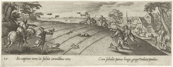 Editor: So, this is "Bird Hunt with Dogs" by the Workshop of Philips Galle. It looks like an engraving. What strikes me is the sense of action, the hunt unfolding across the field. What do you see in this piece? Curator: I see a landscape not merely depicted, but possessed. Consider the power dynamics: hunting, historically, was a privilege, a marker of social status. Who gets to exert dominion over nature, and by extension, over those who depend on it? Editor: So, it's not just a scene of hunting; it’s about power? Curator: Precisely. The hunt, throughout art history, has often been used to reinforce hierarchies and legitimize social control. The act of taking life becomes a symbol of authority. Editor: That reframes the entire image for me. I see the hunters less as sportsmen and more as symbols of a system. Curator: It's a chilling reminder that even seemingly benign scenes can be laden with complex social and political meanings.