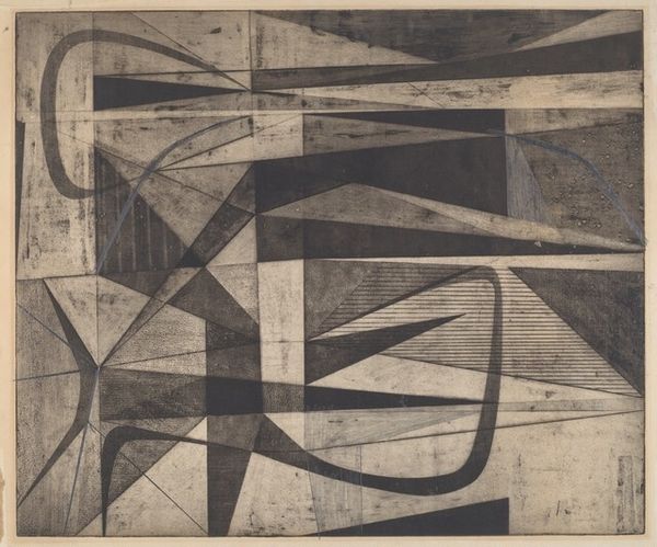 Thomas Harry Kapsalis made "Precarious Situation", a print, in 1949. It's a playground of shapes, almost like a visual alphabet where each form has a delicate balance of positive and negative space. The texture! It's not smooth, but it's got this great, almost scratchy feel. Look closely, and you can see how the ink sits on the paper, giving each shape its own distinct character. The white shapes push forward, creating a layered, almost floating sensation against the dark background. Take, for example, that star-like shape. It's not perfect, it's edges are uneven, almost as if it's been carved out of wood. It reminds me a little of Miro, or maybe even some of Gorky's more playful forms, but there's a rawness here, a sense of experimentation that feels very personal. It's not about perfection, it's about the act of making and seeing what happens. It's a conversation between the artist and the material, and we're invited to eavesdrop.