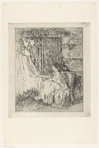 Editor: Here we have Paul-Albert Besnard's 1913 ink drawing, "Amorous Conversation." It’s delicate and intimate; you can almost feel the hushed atmosphere. How do you interpret this piece within its historical context? Curator: That's a great observation. The romantic style places it firmly within an artistic tradition, but it also comes at a time when traditional societal structures were being questioned and re-defined. We must consider the function and placement of romantic artworks during this period, which were publicly accepted and expected. Given that it is titled ‘Amorous Conversation,’ how might the depiction of intimacy differ from previous eras, especially with societal shifts influencing its display and interpretation? Editor: Interesting. I hadn't considered how changing social mores might influence how it was perceived back then. It feels like a very private moment made public. Curator: Precisely. Look at how the figures are positioned. They appear somewhat nestled and hidden within a sketch of greenery. Given the public display of such a work, it begs the question of whether such a private scene, by virtue of its public display, could influence changes in social behaviors. How might this “Amorous Conversation”, once viewed privately, become a subject of public consumption, ultimately impacting societal norms surrounding intimacy? Editor: I see what you mean. Showing this intimacy in a gallery could then almost become a commentary on shifting social boundaries, perhaps challenging traditional norms? Curator: Exactly! And remember, museums and galleries weren't neutral spaces; they played an active role in shaping taste and reinforcing or challenging prevailing ideologies. This piece shows a turn in thinking. Where intimate displays such as these go public, it changes the meaning we read from the art. What do you take away from how socio-political structures affect artistic expression in turn? Editor: That context completely shifts my understanding of the artwork. It makes me realize how artworks are not isolated, aesthetic objects. Rather, they are cultural objects with great power and meaning. Thanks so much. Curator: My pleasure, seeing art within history brings out even more nuance in the experience.