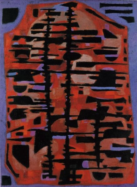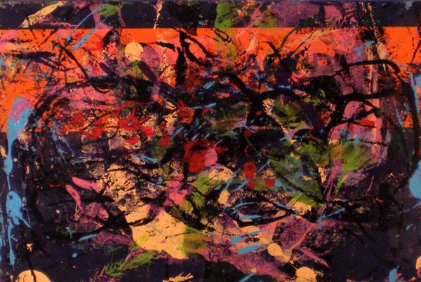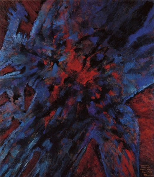 Editor: Here we have Alfred Manessier’s 1961 piece, “Tumulte,” made with acrylic paint. It's dominated by a dark palette, punctuated by fiery reds and cool blues. It feels both chaotic and restrained at the same time. How do you read this piece? Curator: “Tumulte”, chaos, right? But for me, it's more than just visual pandemonium. The title itself is a clue – Manessier’s work, particularly in this period, grapples with spiritual and existential questions. I see it as a landscape of the soul. That dominant darkness could represent doubt, struggle, maybe even a kind of dark night. But then you have those bursts of red, fighting through – perhaps a flicker of hope, of passion, of life itself. Notice how those colors, though intense, are somewhat contained. What do you think that restraint suggests? Editor: That containment… maybe it’s about finding a little light even in the darkest, most turbulent times. So even in total chaos, there’s still order, or at least, the possibility of it. Curator: Exactly! Or maybe it’s about how even our strongest emotions are, ultimately, transient. Think of it as an echo of personal experience, or, bigger, the echo of humanity – searching, questioning, enduring. What resonates with you the most? Editor: I love the idea of it being a kind of emotional weather map. Like, you can see the storm brewing, but also, the moments of sunlight pushing through. That contrast really sticks with me. Curator: It is powerful, isn't it? It speaks to the tension between inner turmoil and resilience that exists in all of us. I always learn something new each time, and seeing your view helps me appreciate its depth even more.