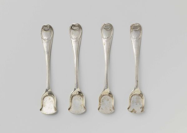 Editor: These are "Set of Four Salt Spoons" by James Rood. I'm struck by how aged they look. How do you interpret these utilitarian objects as art? Curator: Their tarnished surfaces tell a story, don't they? These spoons aren’t just tools; they're relics of a specific social history. Salt, once a precious commodity, became democratized. Who had access to these spoons, and what does that signify about class and privilege? Editor: So, their value lies in what they represent about society at the time? Curator: Precisely. They invite us to consider the power dynamics embedded even in the simplest domestic objects, and how everyday rituals reinforce social structures. Editor: That gives me a new appreciation for the meaning behind something so seemingly simple. Curator: And hopefully inspires us to question the systems around us.