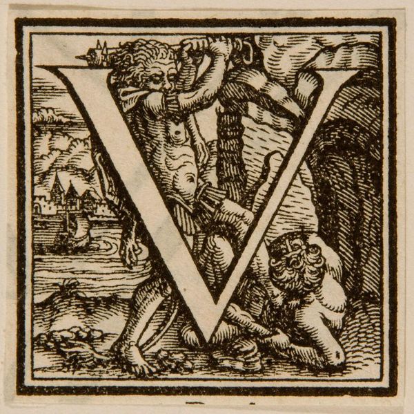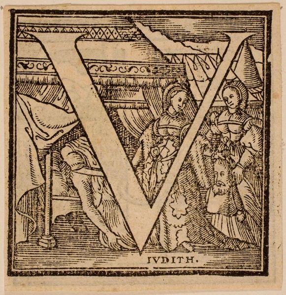 Editor: This intriguing woodcut, titled "Letter V" by an anonymous artist, features figures within the letterform. It's quite detailed. What can you tell us about this piece? Curator: Well, its original function likely served as a decorative element in early printed books, reflecting the increasing literacy and the democratization of knowledge. Notice how the figures are arranged; what social dynamics might they represent? Editor: I see people conversing. Could it be a commentary on classical gatherings, perhaps a statement about the power of dialogue in Renaissance culture? Curator: Precisely. Its presence in a book elevates the text and suggests the patron’s sophistication. The "V" itself gains symbolic weight. What else do you observe? Editor: That early printing served not only the purpose of education, but as a display of social class and sophistication. Thanks for your insight! Curator: My pleasure. It's a fascinating intersection of art, social history, and the written word.