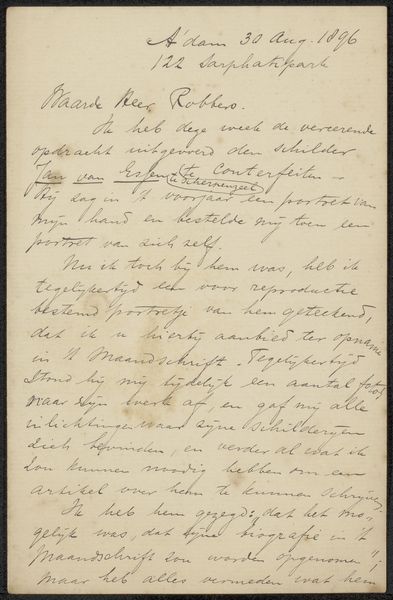 Curator: So, this is "Brief aan Jan Veth" by Willem Bastiaan Tholen, thought to be from 1886. It's an ink and pen drawing held at the Rijksmuseum. Seeing it in person, you can appreciate the delicate linework, and there's a raw, immediate quality to a handwritten letter that printed text just can’t capture. What catches your eye about this piece? Editor: Well, the handwritten nature of the letter really does grab your attention first. It makes you wonder about the kind of paper Tholen used, the specific ink, the very act of him writing each word with the pen. But why make a drawing of a letter instead of just… sending the letter? Curator: Exactly! What was the social purpose of the hand written note? The very materials become signifiers, don’t they? Was it a study in light? Pen and ink were relatively cheap. Was this a tool, a communication, or an artwork? Who was meant to consume this letter, as artwork or simply as information? Editor: I see your point! Thinking about the paper – its quality, its sourcing – all that tells a story. Was he deliberately using finer materials for someone he respected? Or was it simply what was available to him, reflecting his social standing at that time? What does the recipient's likely response contribute to the total value of the work, if anything? Curator: Absolutely. The work itself becomes a product of that entire exchange. That is why context is also important. By considering the broader scope of factors, it affects our understanding of not only the materials used, but how we define art altogether. Editor: So, looking at art from a Materialist view gives a new way to look at everyday items. Thanks! Curator: It definitely challenges established, restrictive ideas on art history. It’s been my pleasure.
