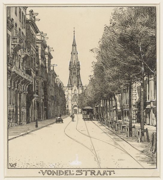 Editor: This drawing, "De Egelantiers Dwarsstraat te Amsterdam," created with ink and pencil sometime between 1870 and 1926 by Willem Wenckebach, really captures the stillness of this street scene, doesn't it? I'm struck by how the artist uses line and shading to create depth. How do you read the composition of this piece? Curator: The effectiveness of the piece lies precisely in its orchestration of contrasting linear elements. Consider the orthogonal lines defining the street and buildings, which are then counterpointed by the subtle tapering as the street recedes into the distance. This, combined with the variation in line weight, dictates the viewer’s gaze toward the focal point: the distant tower. Editor: So, you're saying that the lines aren't just descriptive; they're directing our vision? Curator: Precisely. Note the calculated arrangement of light and dark, achieved through the density and direction of the lines. This, in turn, modulates the tonal range and constructs spatial recession. The structural elements—the lines, the tones—aren’t merely representational. They articulate the very architecture of the image. Editor: That's fascinating. I hadn't thought about how the lines themselves create space, almost independently of what they depict. Did Wenckebach play with this in other works, perhaps distorting perspective for effect? Curator: That’s an interesting line of inquiry. Analyzing other works by the artist might reveal consistent patterns in how he manipulated linear perspective and tonal arrangements. Editor: I see what you mean! It seems so obvious now. It makes me look at drawings in a whole new way. Curator: Indeed. Engaging with art in this manner allows us to see beyond mere representation and delve into the intrinsic language of visual forms.